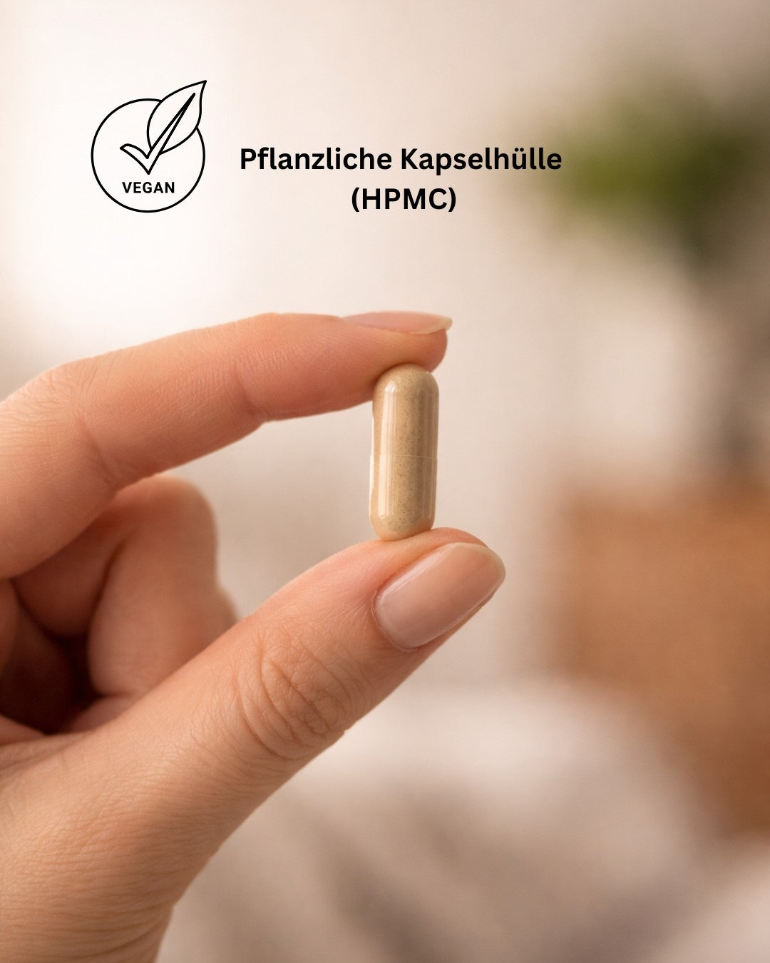 HerzensRuhe ist 100 % vegan und wird in pflanzlichen Kapselhüllen (HPMC) abgefüllt.