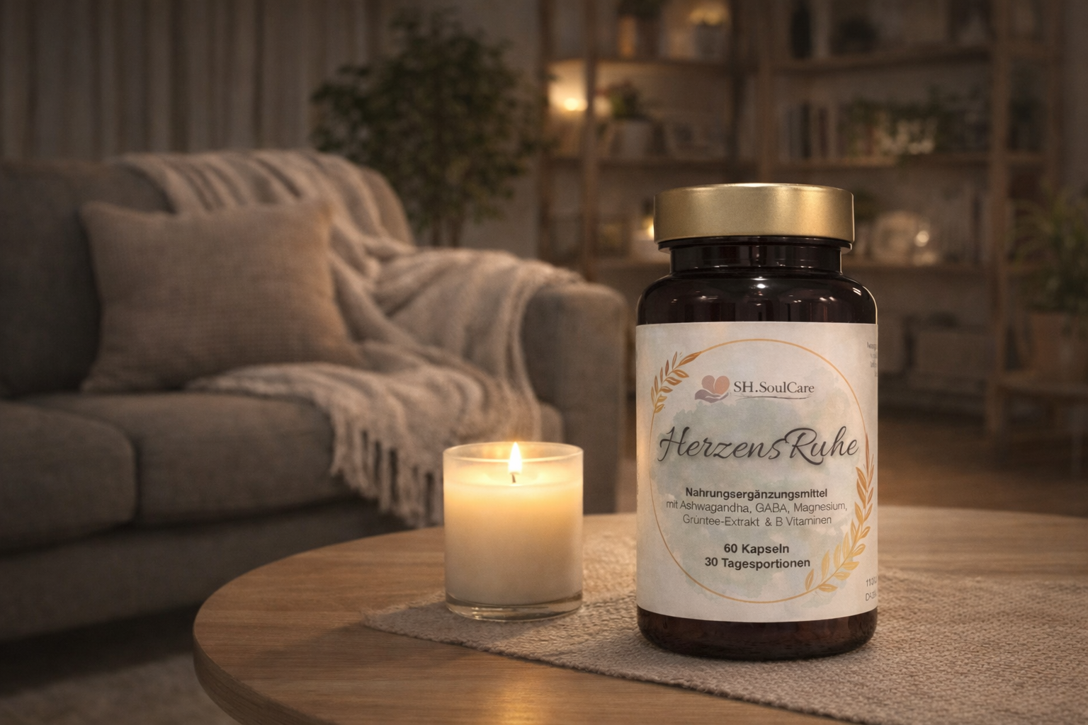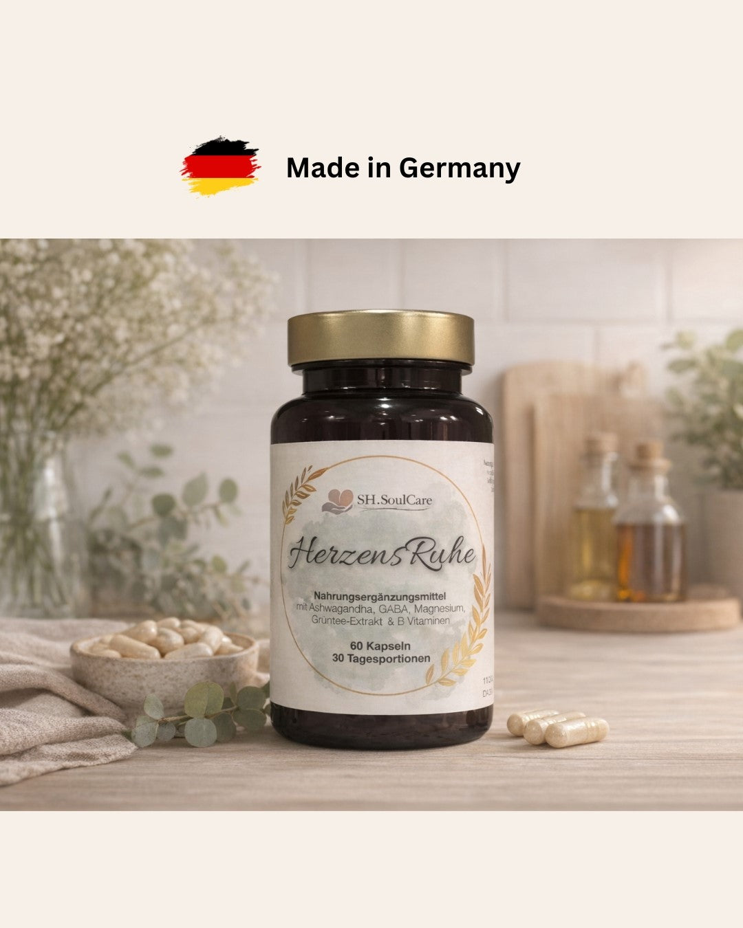 HerzensRuhe ist ein Nahrungsergänzungsmittel-Komplex mit sorgfältig ausgewählten Inhaltsstoffen wie Magnesium, B-Vitaminen sowie pflanzlichen Bestandteilen. Das Produkt wurde entwickelt, um bewusst in eine Abendroutine integriert zu werden.